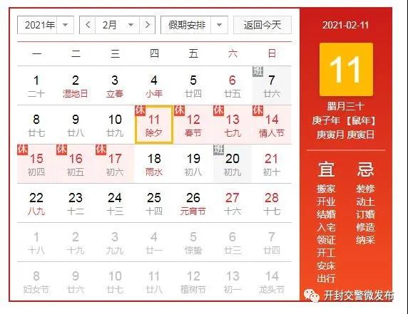春运 春节放假时间:2021年春运将从 1月28日开始,至3月8日结束,共计40天。春节放假时间安排为 2月11日——2月17日,共7天。期间7座以下(含7座)小型客车高速公路免费通行,免收通行费时间以车辆驶离高速公路出口收费车道的时间为准。