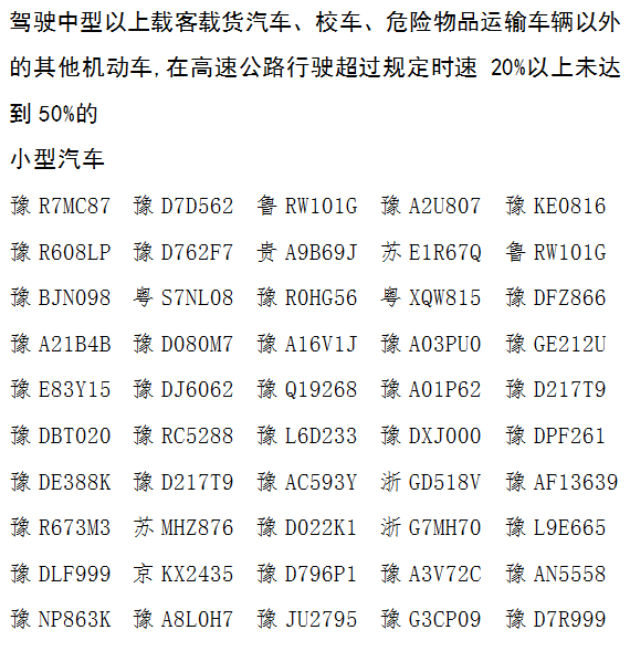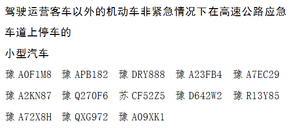 为确保高速公路通行有序,有效预防事故,全力保障高速公路安全、有序、畅通,许昌市公安局交通管理支队第二高速公路执勤大队通过民警现场查处、电子警察抓拍和群众违法举报等多种方式严查高速公路交通违法行为。现集中曝光近期查处的违法车辆号牌,警示交通违法,消除安全隐患,守护群众出行平安。