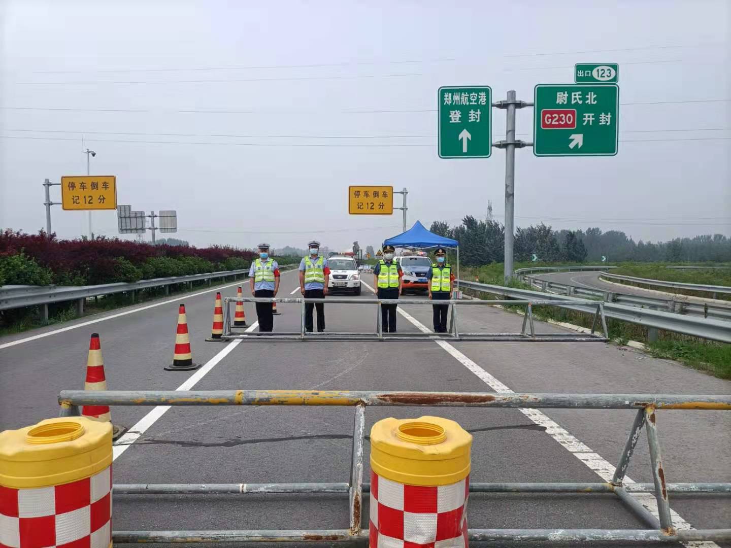 商登126KM—128KM处因洪水长时间浸泡,路面存在隐患,我队人员一边在此处进行分流(主要针对中大型车辆),一边在三个站口防疫劝返卡点,面对一些不理解、不配合的司乘人员,进行批评教育工作或者按照相关规定进行处罚。