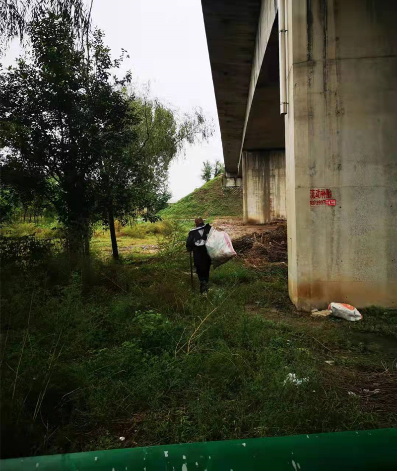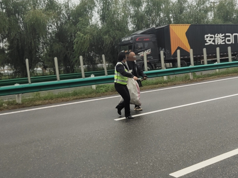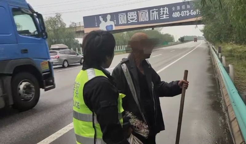 阴雨绵绵老汉高速公路拾垃圾,濮阳高速交警及时劝离除隐患
