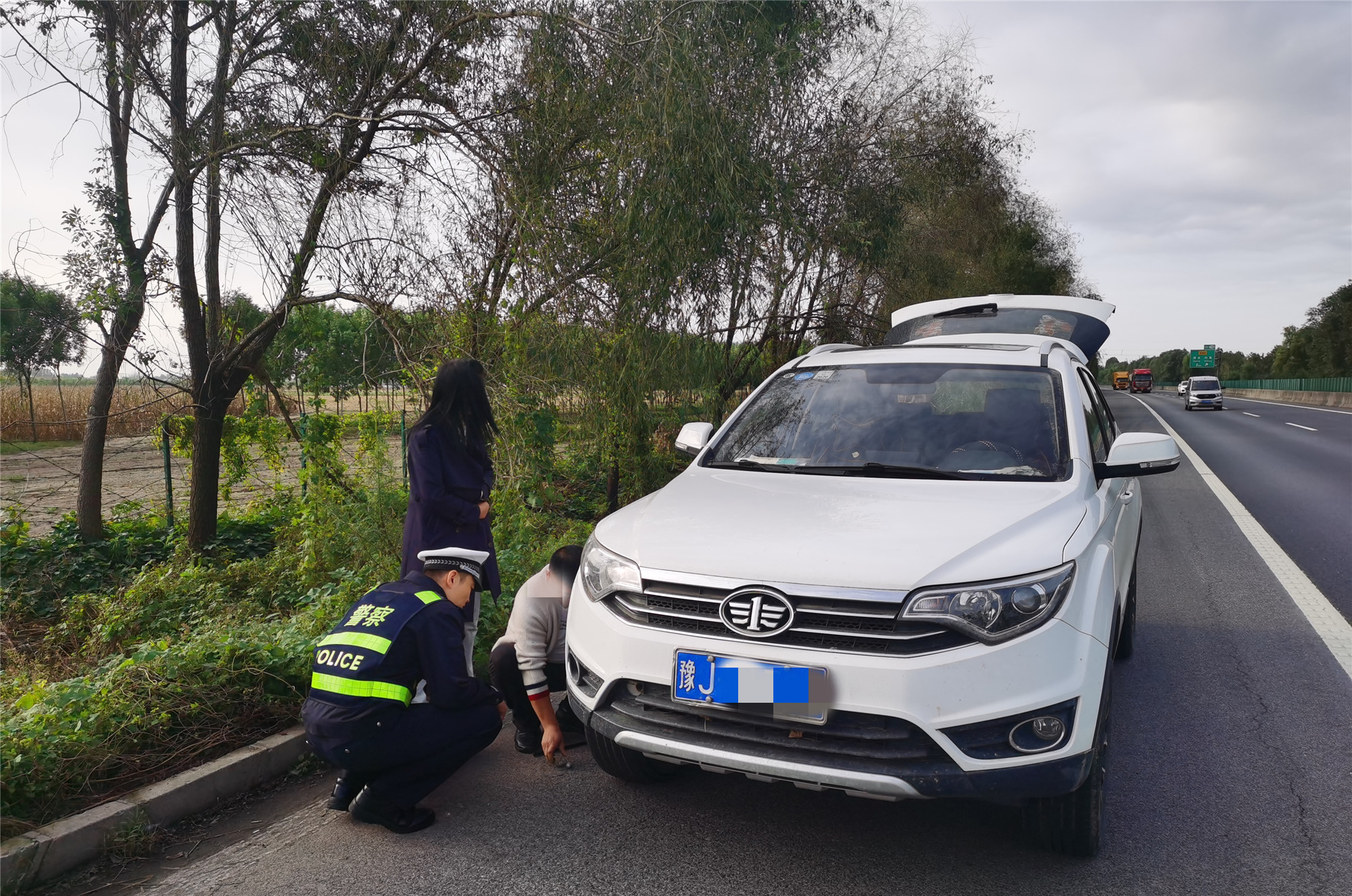 10月10日,濮阳高速交警巡逻民警热心帮助受困群众更换轮胎,及时消除一起安全隐患。