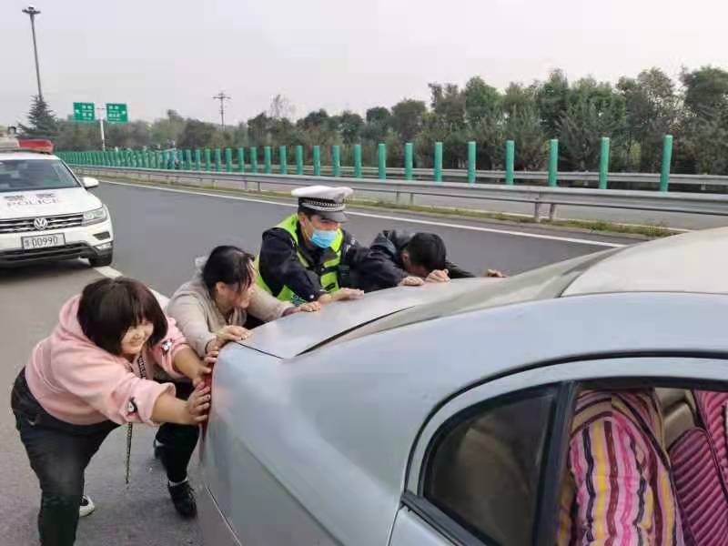 民警二话不说上前与几人一起推车,车上小孩子用崇拜的目光注视着民警。大概200米,车辆被推出偃师收费站。大姐激动地握着民警的手连连表示感谢!