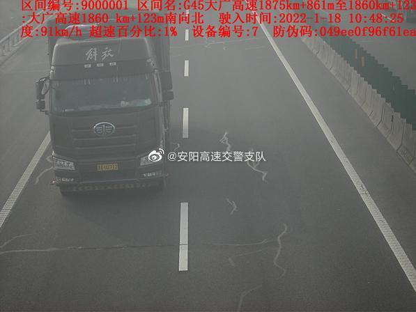 【违法曝光台】 2022年1月18日10时48分,黑AU2712的大型货车在大广高速1875公里861米至大广高速1860公里123米处实施驾驶中型以上载货汽车在高速公路上行驶超过规定时速未达20%的违法行为,扣6分,罚款200元。高速交警温馨提示:请依法、安全、文明行车,平安出行!