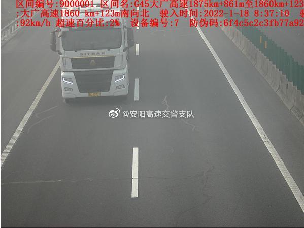 #文明交通•安全伴您行# 【违法曝光台】 2022年1月18日08时37分,黑CA2021的大型货车在大广高速1875公里861米至大广高速1860公里123米处实施驾驶中型以上载货汽车在高速公路上行驶超过规定时速未达20%的违法 ...