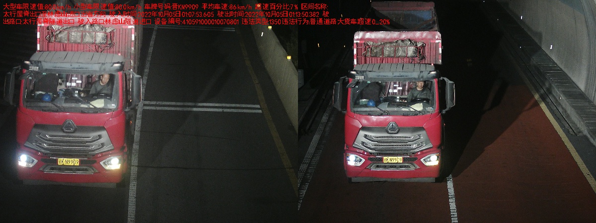 #文明交通•安全伴您行# 【违法曝光台】 2022年10月05日01时07分,晋KN9909的大型货车在太行屋脊进口至林虑山出口处驾驶中型以上载货汽车在高速公路上行驶超过规定时速未达到20%的违法行为,扣6分,罚款200 ...