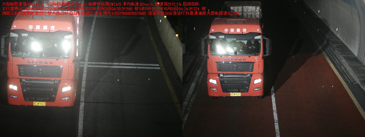 #文明交通•安全伴您行# 【违法曝光台】 2022年06月05日04时20分,豫EW7613的大型货车在太行屋脊进口至林虑山出口处驾驶中型以上载货汽车在高速公路上行驶超过规定时速未达到20%的违法行为,扣6分,罚款200 ...