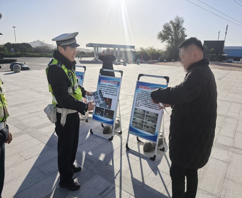 “这些案例都是辖区内发生的真实事件,就是想让大家直观感受到交通违法的危害。”民警一边引导司乘人员参观展板,一边结合案例讲解安全常识。在服务区主楼前、加油站、充电站等人员密集区域,民警逐一发放宣传资料,针对“儿童安全座椅如何正确使用”“高速行车突发故障该怎么办”等热点问题耐心解答。同时,民警还向服务区商户和员工普及交通安全劝导技巧,鼓励他们发挥“安全协管员”作用,引导车辆有序停放,共同打造安全有序的服务区环境。